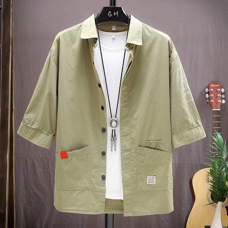 绿惠旗舰店夏季新款七分袖衬衫男士工装纯棉衬衣外套男恒如服饰。热门设计联盟服务商
