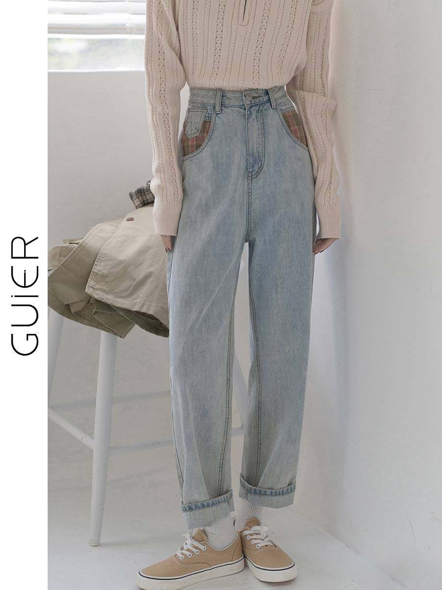 秋冬加绒格子口袋拼接牛仔裤女2021年新款设计感小众高腰直筒裤热门设计联盟服务商